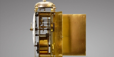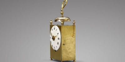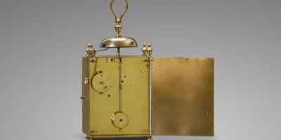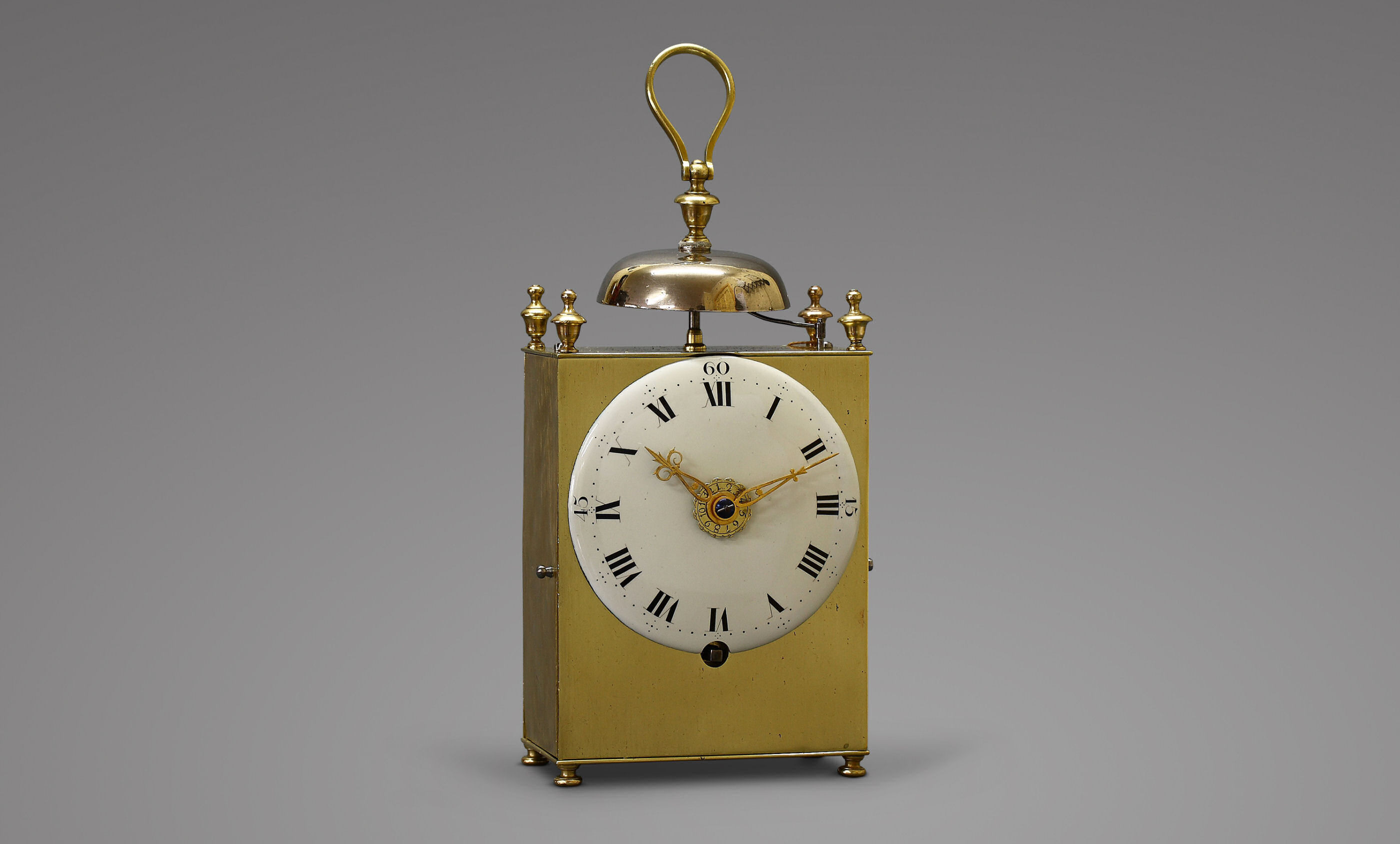 Late 18th C. French Capucine, enamel dial with Roman numerals for the hours, and arabic numerals for the quarter markers. Finely cut and engraved gilt hands. Nineteen-days long duration movement with large spring barrel, anchor recoil escapement with silk suspension. Alarm system set by the disk in the middle of the dial, and wound by pulling the string on the left side.