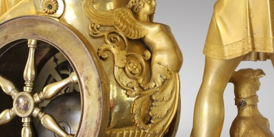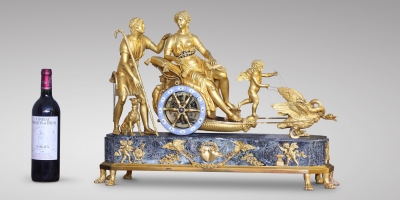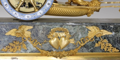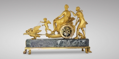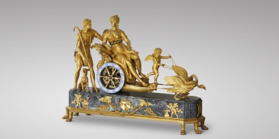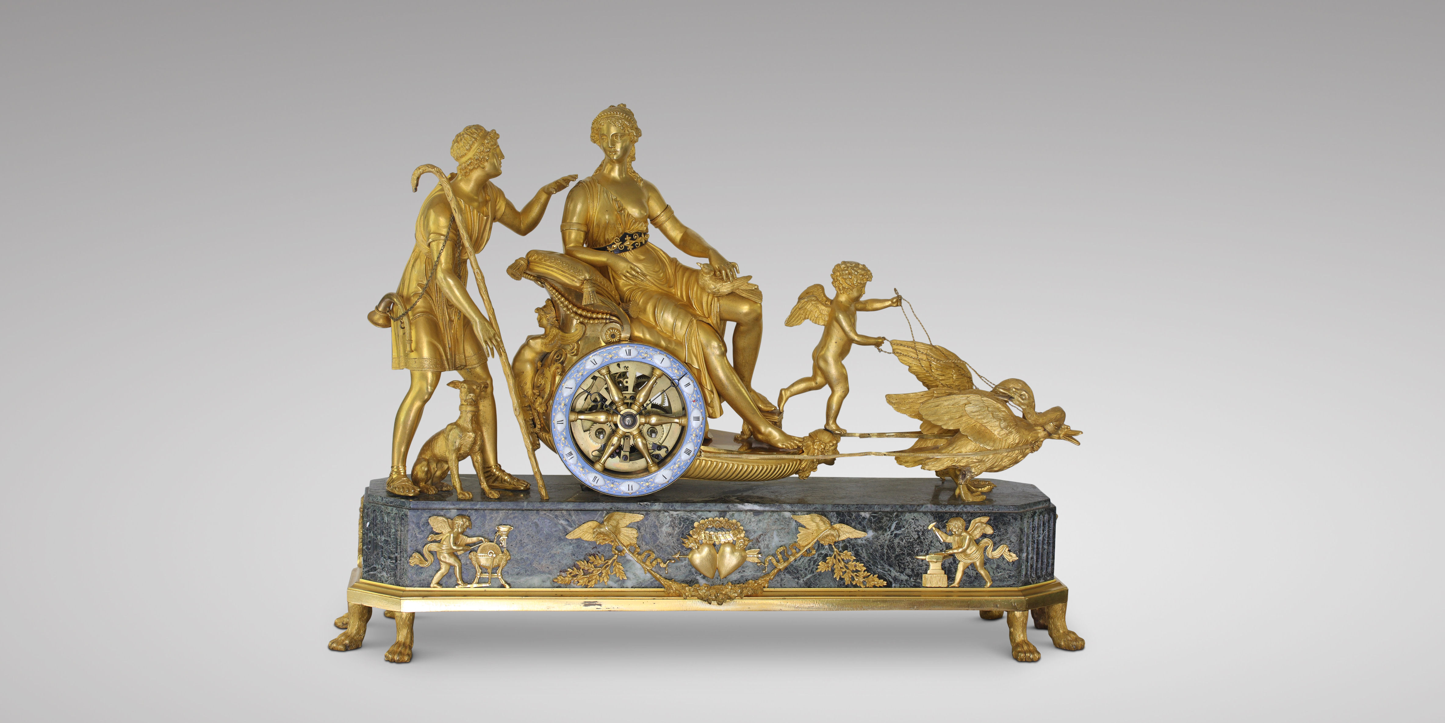 Attributed to André Antoine Ravrio (1759 - 1814) Exceptional Empire period Mantel Clock: “The Chariot Of Venus”, Paris, circa 1805. Chased and gilded bronze,Vert de mer marble plinth, on eight lion-paw feet, dial by Coteau, signed Leroy à Paris. The partially draped Venus, seated in her chariot, a dove on her knee, seems to be conversing with the handsome Adonis, an ardent hunter with whom she has fallen in love; she is assisted by Cupid, who, balancing his weight on one foot, holds the reins of the swan-drawn chariot. Dressed as a simple shepherd, Adonis is accompanied by his dog and carries a horn and hunting spear. The plinth is cast with a chased-bronze frieze decorated with the attributes of love: two doves in flight hold a flower garland centred by a crowned double-heart trophy and are flanked on each side with a cupid forging love weaponry. Executed by Coteau, the ring-shaped dial features Roman hour numerals centred within small gilt-trimmed medallions and a very delicate floral and palmette décor on a light-blue enamel ground. Blued steel Breguet hands indicate the hours and minutes. The dial is set within the chariot’s wheel, its six spokes creating open-work intervals that allow the “skeleton” movement and all its interior elements to be viewed from all sides.
