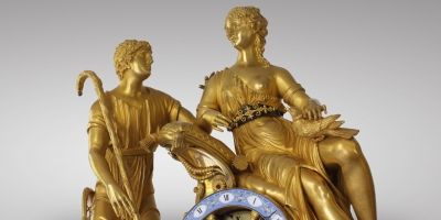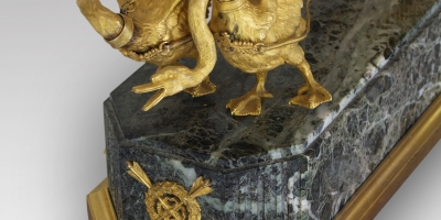 Regarded in its time as a standard decorative arts subject, the theme of Venus and her chariot was appreciated more for its ornamental value than for its functional qualities: the dial set within the wheel made it difficult to read the time. Under Napoleon I pleasant genre scenes evoking the charms of the art of Louis XVI can be found decorating the palaces. In the domain of clockmaking, the chariot became an increasingly feminine motif. Love, nudity and seduction in a variety of metaphorical terms made gradual inroads in a society dominated by military art. Triggered by popular demand, the swan, mythic symbol of Apollo in love, reappeared in parks – we know that in 1803 Josephine was the first to introduce the black swan to her park at Malmaison; native to western Australia, the black swan was alien to Europe at the time. The swan’s gracefully curved neck became the image of sensuality, replacing the coiled serpent and dolphin so characteristic of the arts of the previous century.